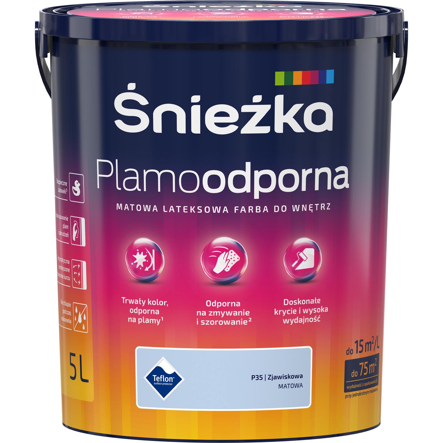 Śnieżka Plamoodporna to lateksowa, matowa farba do aranżacji wnętrz, stworzona z myślą o najbardziej wymagających odbiorcach, którzy poszukują innowacyjnych rozwiązań skrojonych pod ich osobowość i styl. Produkt charakteryzuje się wyjątkową odpornością na plamy, zmywanie i szorowanie na mokro, a więc sprawdzi się nawet w trudnych warunkach. W palecie kolorystycznej Śnieżki Plamoodpornej znalazło się aż 48 trwałych kolorów, co daje ogromne możliwości w zakresie wyboru idealnego odcienia zgodnie z własnymi preferencjami. Dodatkowo, wyrób jest łatwy w użyciu, doskonale kryje i nie chlapie podczas malowania. Spełnia ponadto surowe wymagania europejskiej normy „Bezpieczne zabawki”. Twój ulubiony kolor? Plamoodporny!